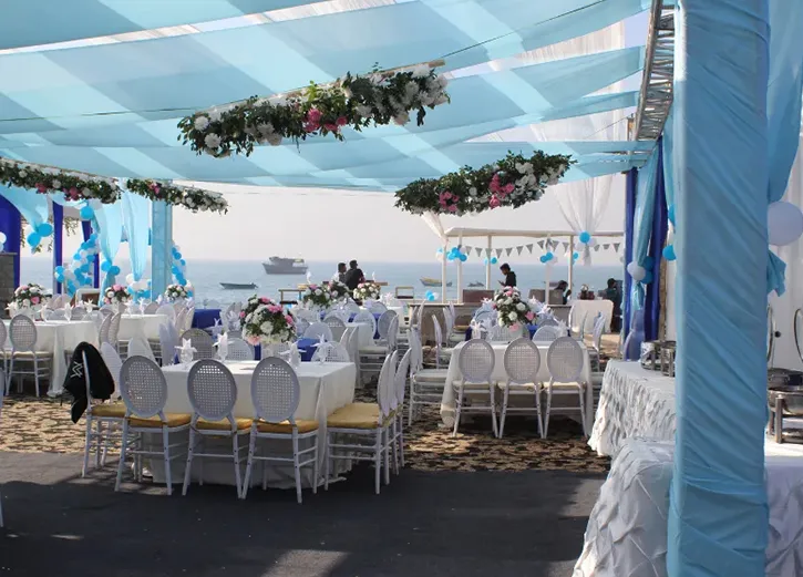 The decoration is also complemented by beach-related decoration, fairy lights, balloons and chairs. Open spaces are free in creative arrangement.
